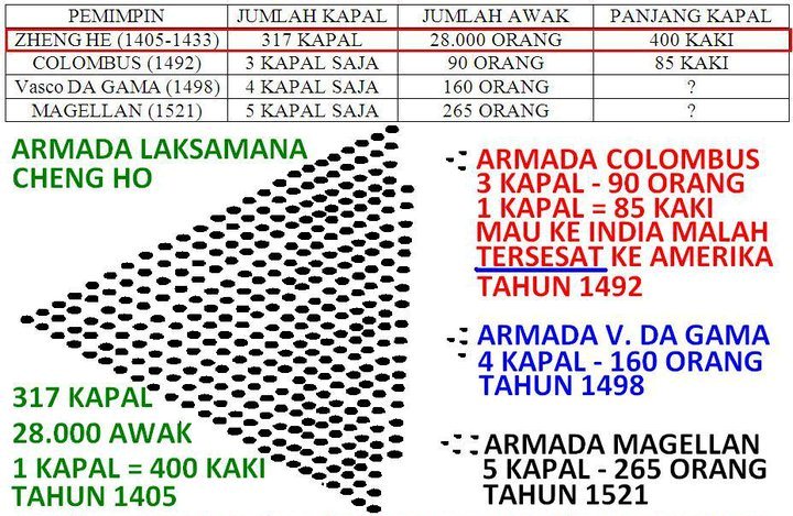 Tahukah anda? sebenarnya laksamana Zheng He atau lebih dikenali sebagai laksamana Cheng Ho di Malaysia dan Indonesia merupakan orang pertama yang menjumpai benua amerika, sekitar 70 tahun sebelum Columbus. Sekitar 70 tahun sebelum Columbus memacakkan benderanya di daratan Amerika, Laksamana Zheng He sudah terlebih dahulu sampai ke sana.